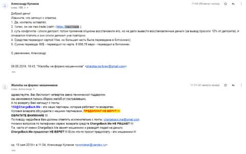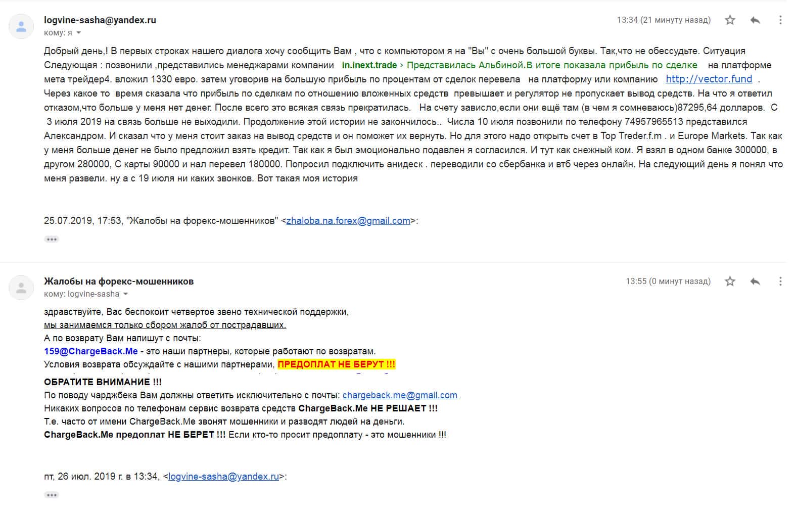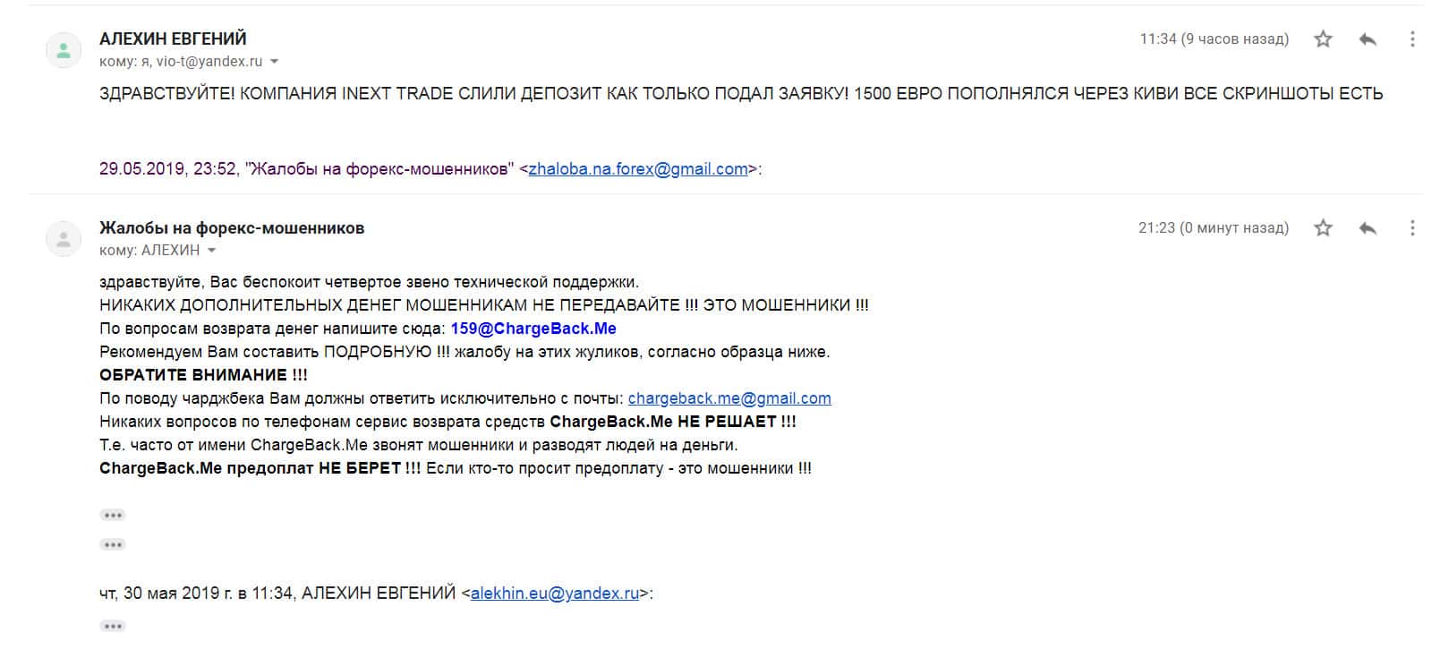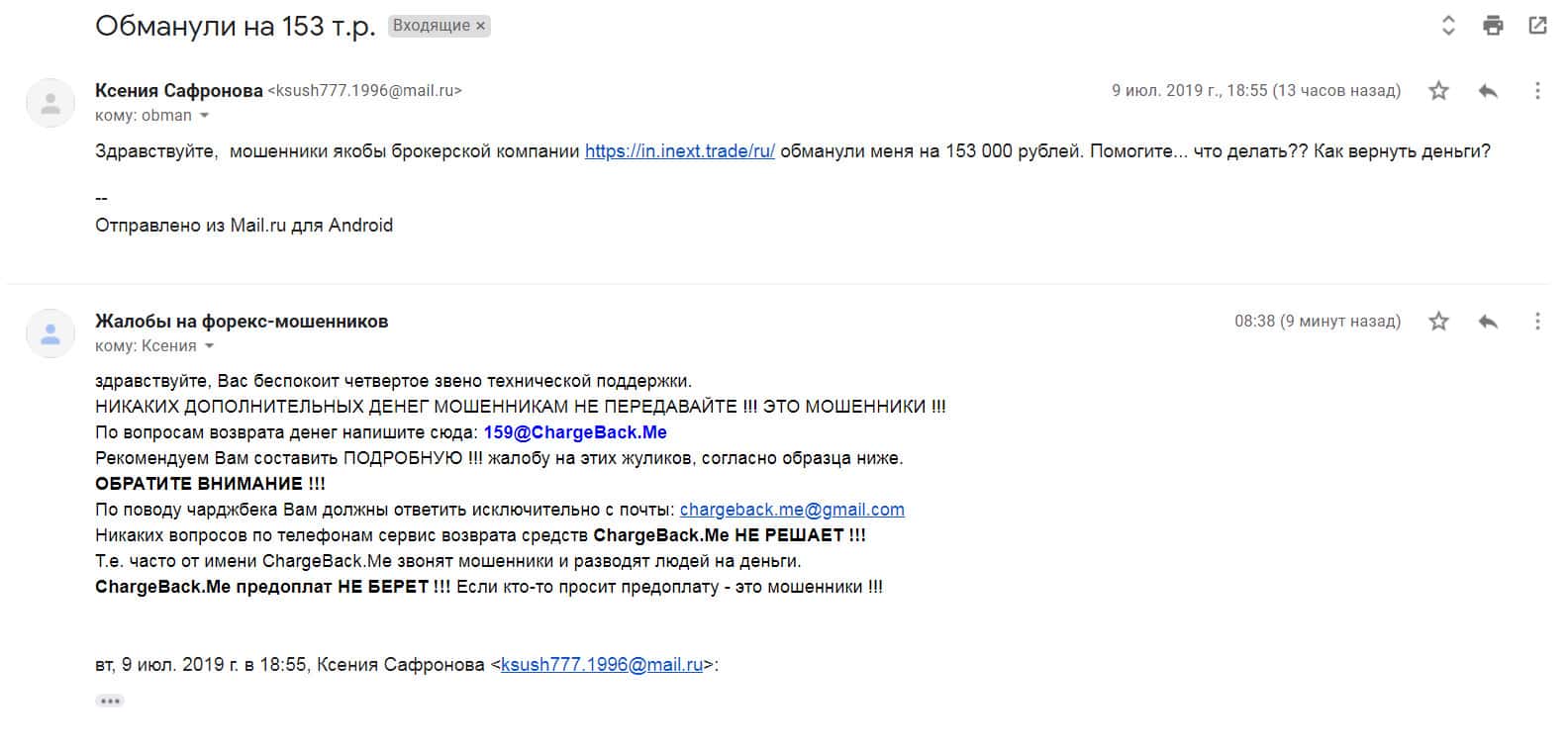 Одному из клиентов конторы йНекст Трейд посоветовали обращаться в специализированную интернет-службу ChargeBack.Me для того, чтобы попытаться вернуть свои вложенные деньги, которые он потерял в данном форекс-лохотроне. Речь идет о 150 000 рублей.