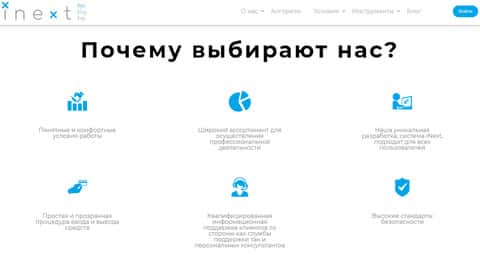 Начинается сайт у лохотрона iNext Trade с довольно простой шапки, которая уже содержит в себе слоганы и призывы торговли у мошенников йНекст Трейд, обещая вам высоты. Однако это будут скорее высоты моментального падения размера вашего счета, который шулера iNext Trade сольют с превеликим удовольствием.