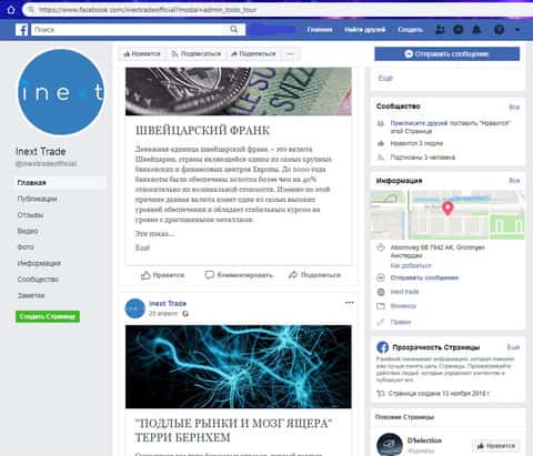 Дабы соответствовать всем современным трендам аферисты iNext Trade обзавелись страницами в социальных сетях, одной из которых является Facebook. Страница шулеров в Фейсбук не имеет абсолютно никакой активности и создана исключительного для того, чтобы было, в чем вы можете убедиться на изображении ниже.