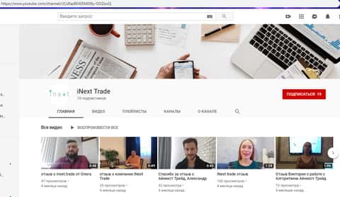 Для размещения различных видео с фальшивыми отзывами мошенники iNext Trade создали аккаунт в социальной сети YouTube. Аналогично предыдущей странице здесь отсутствуют подписчики и просмотры, а страница является отчасти и для работы по разводу наивных пользователей.