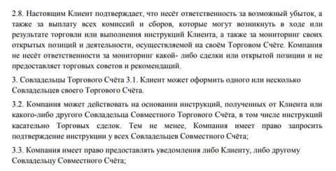 Далее аферисты йНекст Трейд вообще заявляют о том, что они не несут никакой ответственности за все возможные потери клиента, связанные с торговлей у мошенников iNext Trade. На изображении, расположенном ниже, вы можете увидеть данный пункт условий шулеров йНест Трейд.