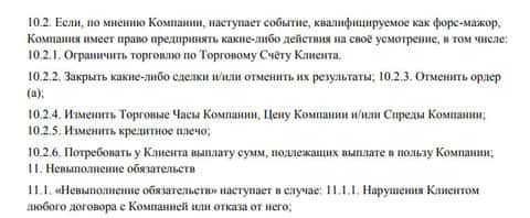 Далее следует информация о том, что жулики йНекст Трейд сами решают, когда наступает период форс-мажорных обстоятельств, а так же не несут ответственности за них. На изображении ниже, вы можете увидеть данный раздел клиентского соглашения аферистов iNext Trade.