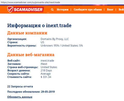 В связи с мошеннической и противозаконной деятельностью жуликов iNext Trade его руководители предпочитают анонимность дабы избежать ответственности , в чем можно убедится с помощью портала scamadviser com, по информации которого аферисты йНекст Трейд скрывают реальное местоположение сервера сайта.