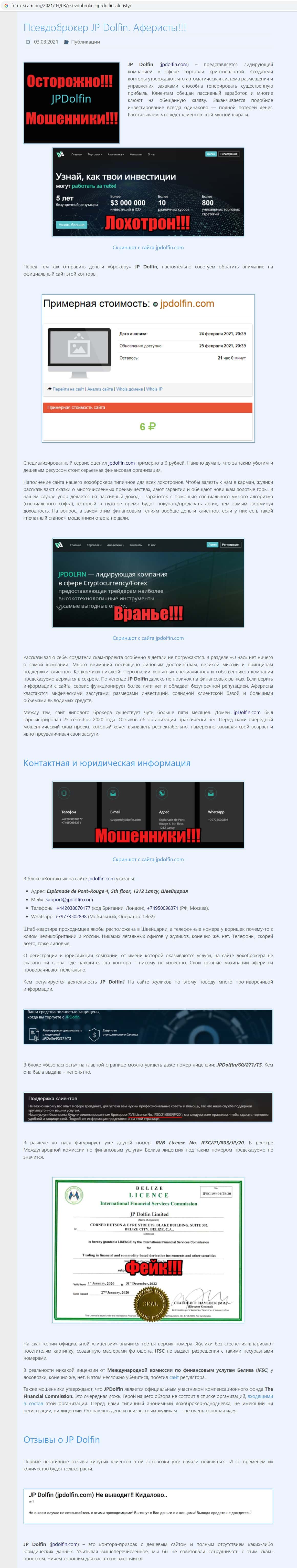 Мы наткнулись на сайт forex-scam org, который утверждает, что компания ДжейПи Долфин является фейковой компанией, которая не имеет никаких юридических документов.