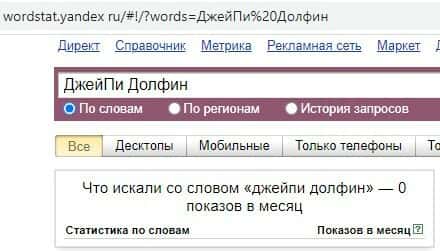 Второй запрос в Яндекс на русском языке с одним пробелом "ДжейПи Долфин" выдает 0 показов в месяц. По такому запросу информацию о мошенниках никто в сети не ищет.