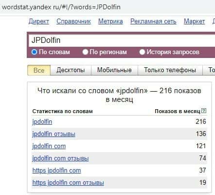Первый запрос в яндексе на английском языке без пробелов "JPDolfin" выдает 216 показов в месяц. Это немалая цифра показов, чтобы обмануть людей на деньги.