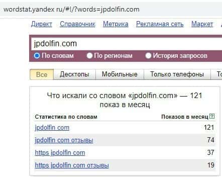 Третий и последний запрос в яндексе на английском языке "jpdolfin com" выдает уже 121 показ в месяц. Это больше, чем в предыдущем случае, но в 2 раза меньше, чем в первом.