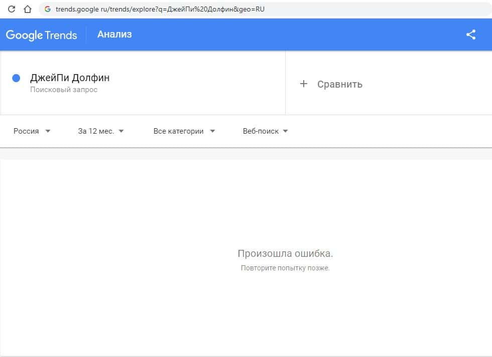 Второй запрос в Google на русском языке с одним пробелом "ДжейПи Долфин" выдает результат в 0 показов в месяц, как и в предыдущем случае.