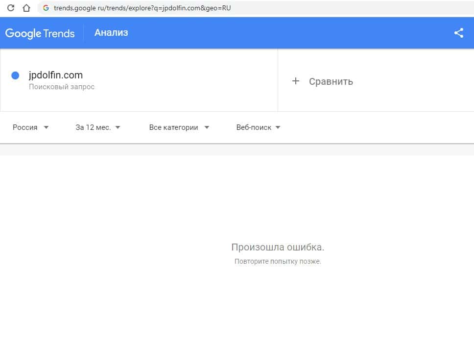 Третий и последний запрос в гугл на английском языке без пробелов и без точек "jpdolfin com" выдает результат, как и в первых двух случаях - 0 показов.