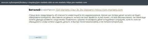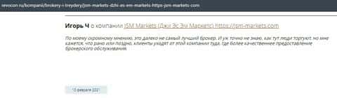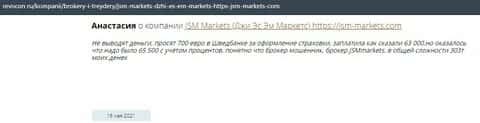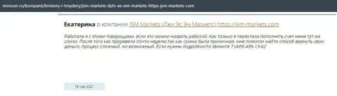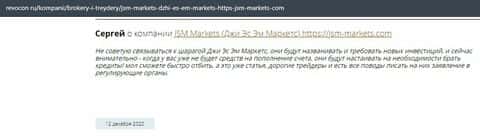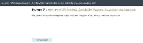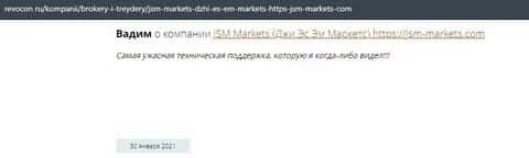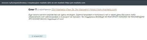Человек в своем отзыве рассказывает, что контора ДжэйЭсЭм Маркетс слила его депозит и все это случилось после запроса на вывод средств. Деньги жулики так и не хотели возвращать.
