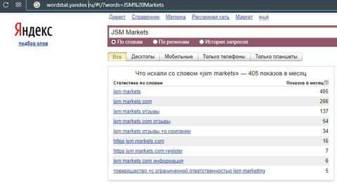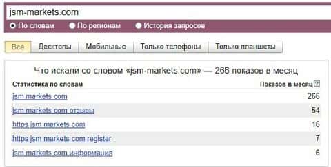 Почти такие же показатели и запроса бренда сайта с точкой. Бренд "jsm-markets.com" набрал за последний месяц 266 показов по версии Яндекс.Вордстат.