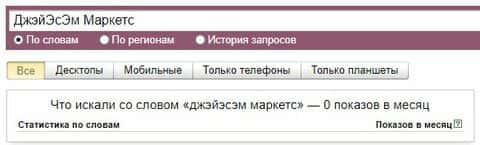 По запросу бренда "ДжэйЭсЭм Маркетс" в поисковой системе Яндекс, контора не набрала показов за месяц вообще, поэтому можно считать ее не популярной.