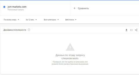 Та же ситуация и с запросом бренда "JSM Markets", и здесь нет популярности вообще, так как мало и Гугл Трендс не может определить источники запросов.