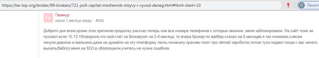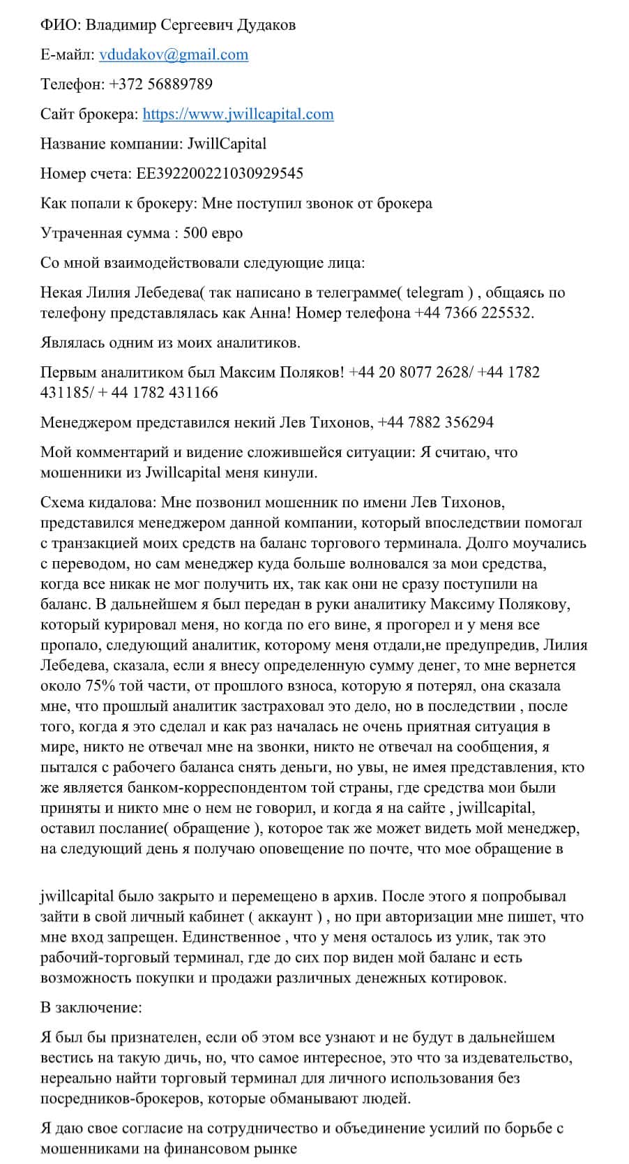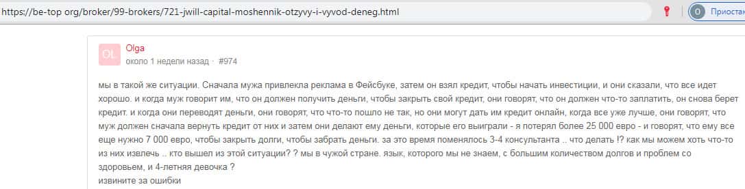 - Очередная жалоба на аферистов в лице организации Jwill Capital - клиент утратил несколько сотен евро