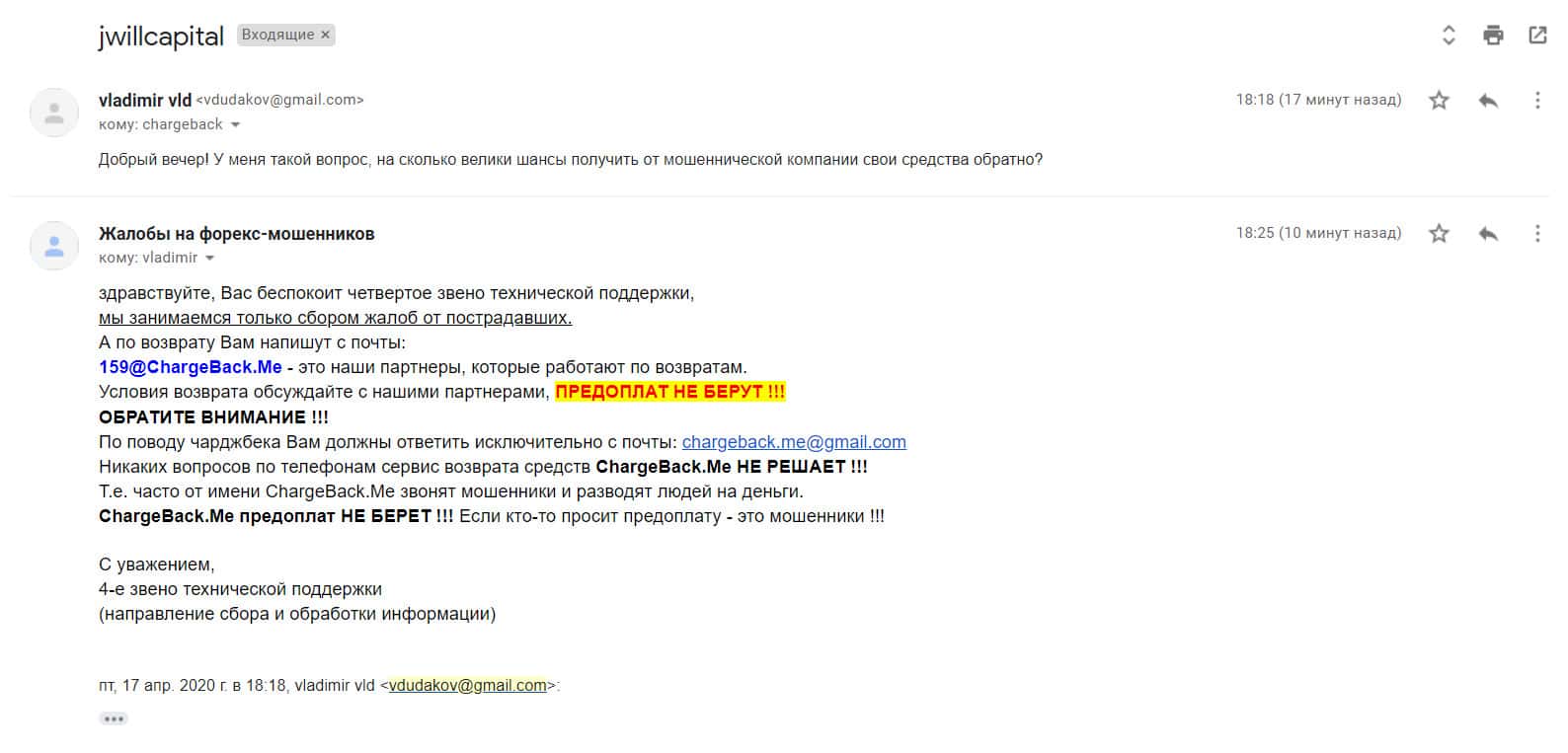 В том случае если бессовестные мошенники JWillCapital Вас развели или попытались это сделать, то в таком случае сообщите Ваш электронный адрес далее, и мы в обязательном порядке с Вами установим связь по электронной почте.