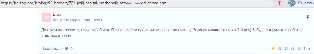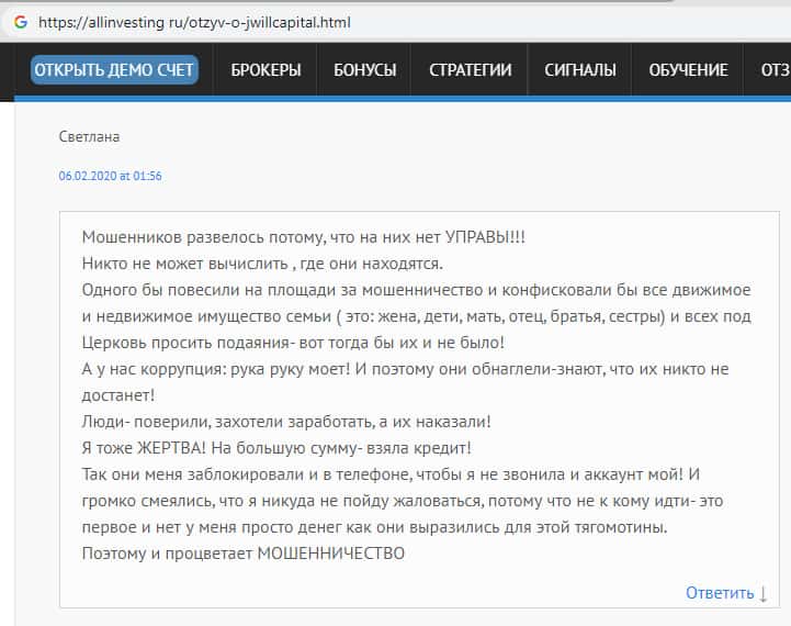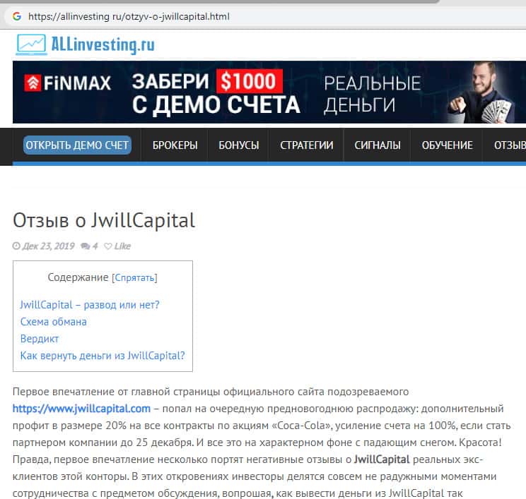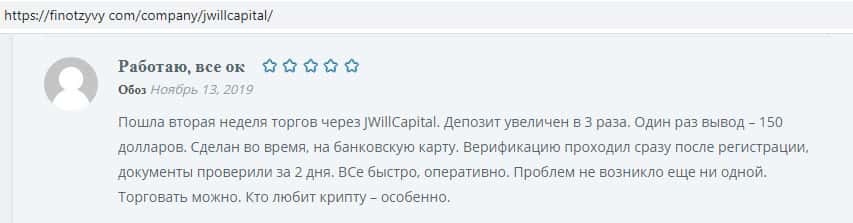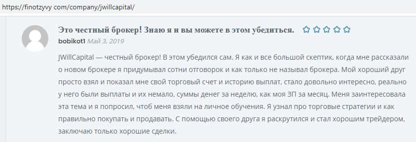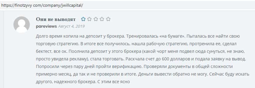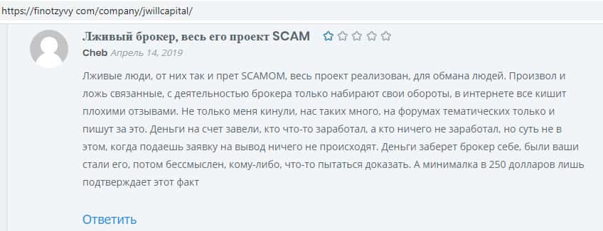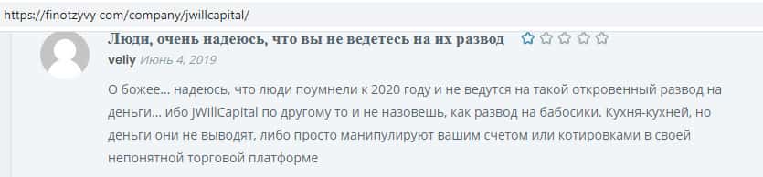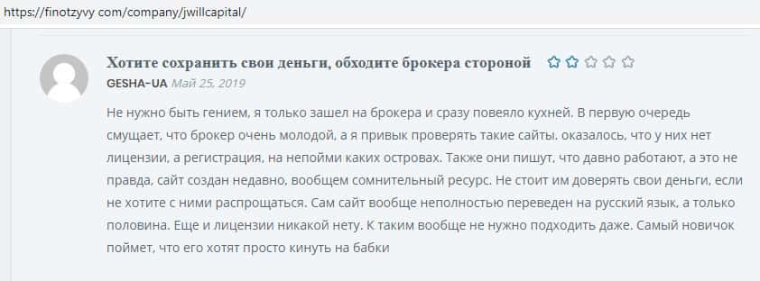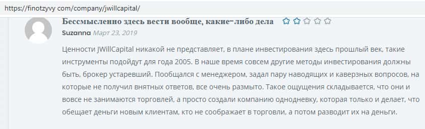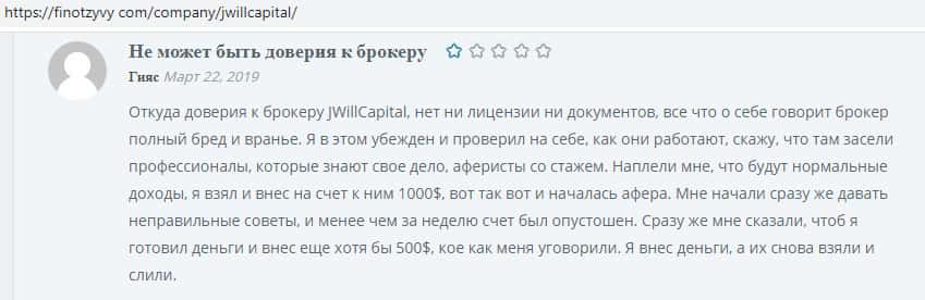 Фиктивный отзыв о брокерской конторе JWillCapital на портале finotzyvy com