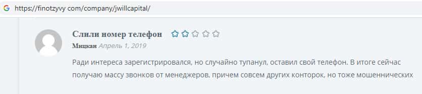 Некто Мицкан на портале finotzyvy com сообщает, что его личные данные брокерская конторка Джей Вилл Капитал слила другим мошенникам. При регистрации он указал свой телефонный номер, и теперь получает массу звонков от других мошеннических контор с "архи" прибыльными предложениями торговли на своих площадках.