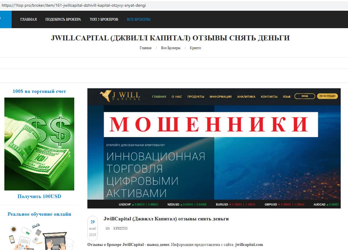 Эксперты портала 1top pro подтверждают общее мнение о жульничестве о обмане на брокерской площадке JWillCapital