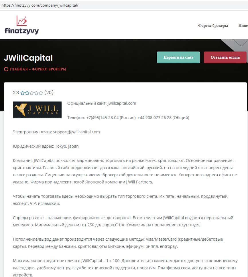 - Фиктивный отзыв о брокерской конторе JWillCapital на портале finotzyvy com