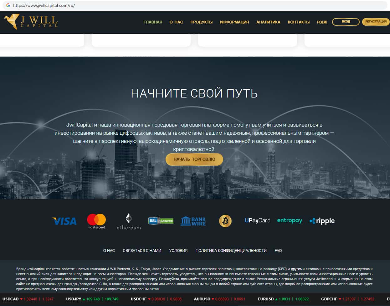 Заканчивается главная страница портала Джей Вилл Капитал очередным приглашением к регистрации, рекламой принимаемых брокерской конторой видов финансовых вложений, от банковских переводов и карт MASTER и VISA, до криптовалют и электронных платежных систем типа entropay.И конечно же краткое предостережение о рисках торговли бинарными опционами.