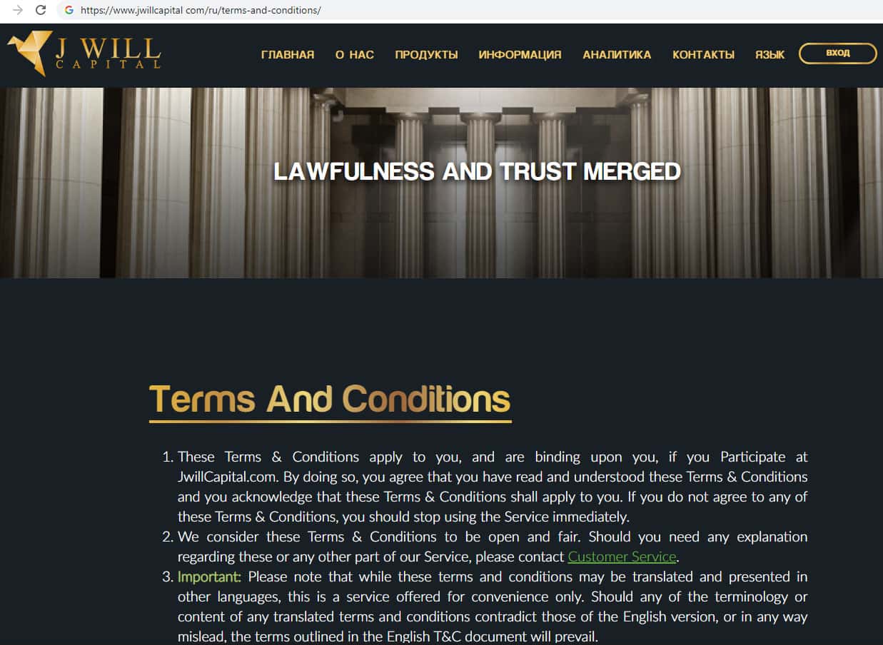 Пользовательское соглашение с условиями использования ресурса jwillcapital com и регламентирующее отношения трейдера с управляющей компанией J Will Partners KK, публикуется исключительно на английском языке, якобы для исключения разночтений этого документа, а на самом деле, в надежде, что клиенту лень будет разбираться в этом.