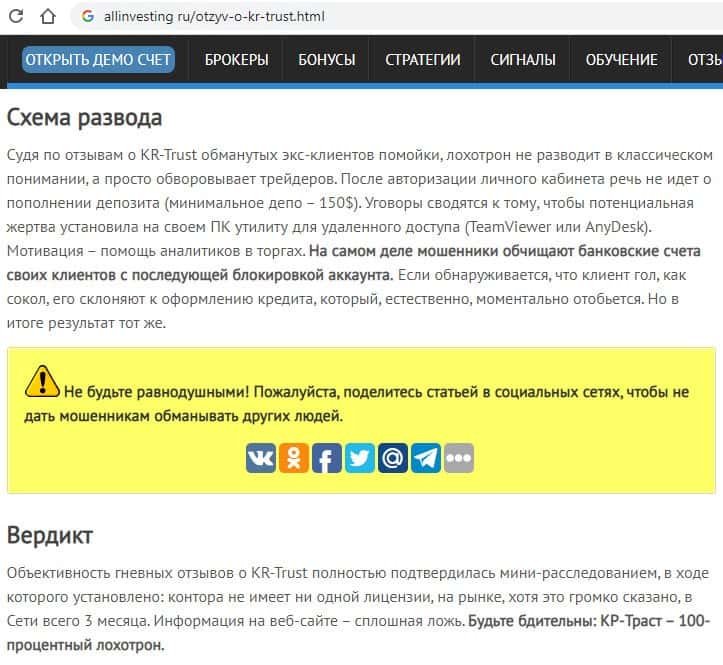 Еще один авторитетный источник в сети раскрывает схему развода мошенников КР Траст и выносит справедливый вердикт к ним, что они - самые обыкновенные мошенники.