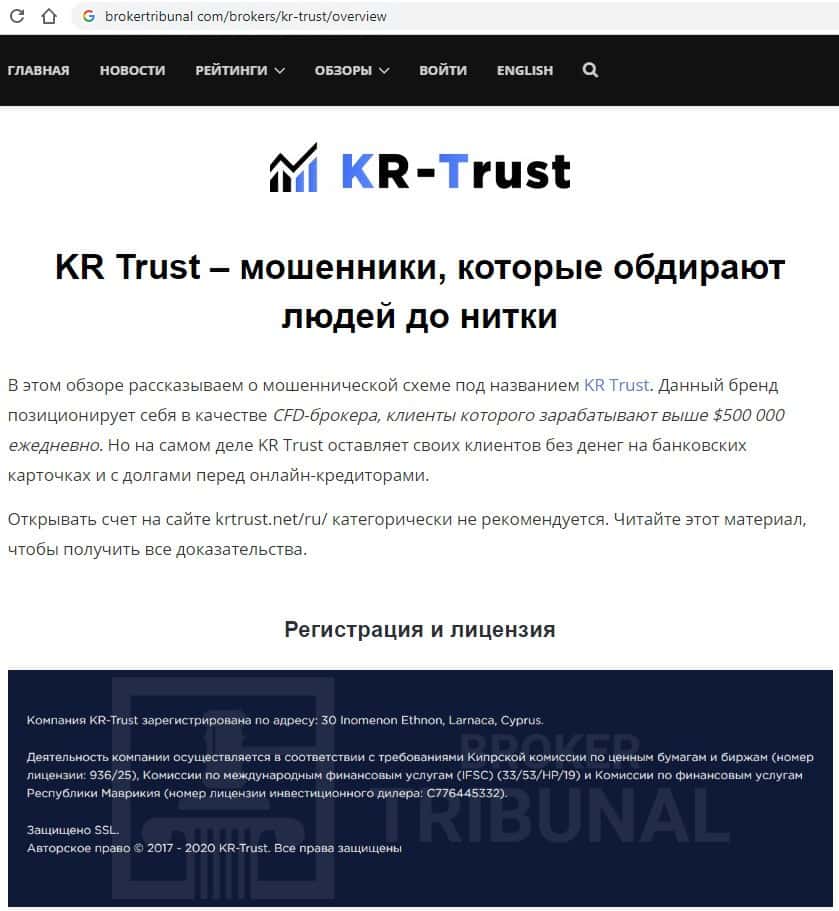 Сами мошенники KRTrust Net у себя на сайте пишут, что зарегистрированы на Кипре, но никаких реальных документов по этому поводу не предоставляют.