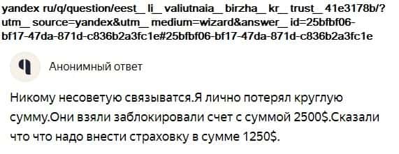 Очередному клиенту мошенники КР Траст просто взяли заблокировали на счету сумму в 2500$ и потом начали рассказывать, что нужно еще внести страховку в сумме 1250$.