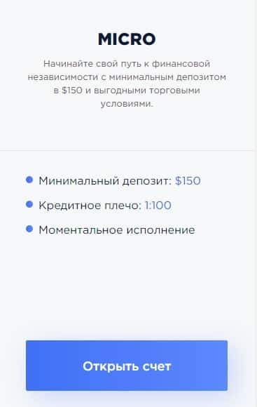 Первый тип счета, в который предлагают вам вложиться жулики КР Траст - это MICRO. Минимальный депозит тут составляет 150$.