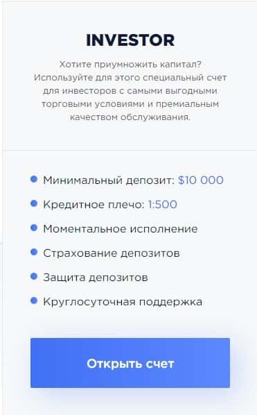 И третий, последний тип счета мошенников - INVESTOR. Тут сумма минимального депозита уже составляет от 10 000 долларов.