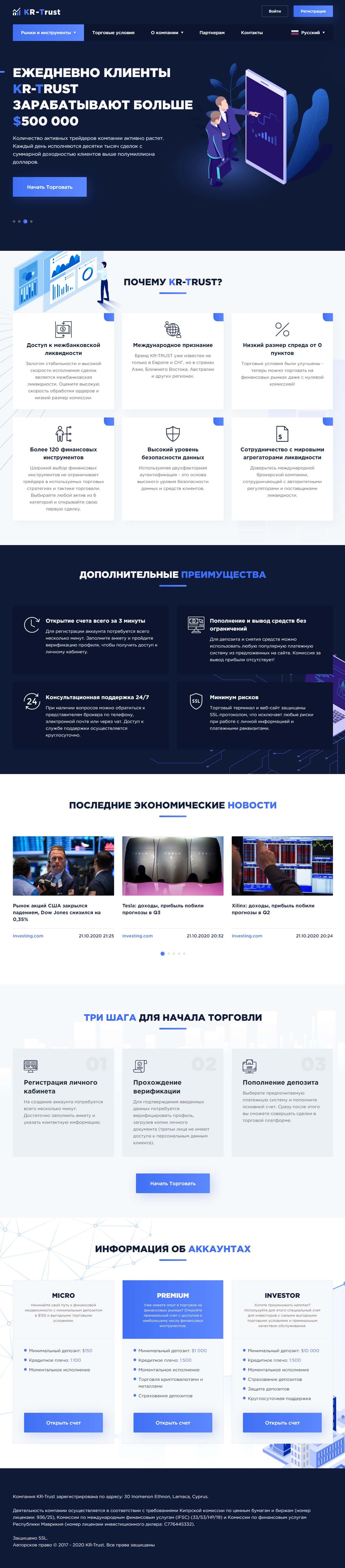 Главная страница сайта krtrust net выглядит как типичный лендинг. На ней мало полезной информации для клиента и дизайн довольно посредственный.