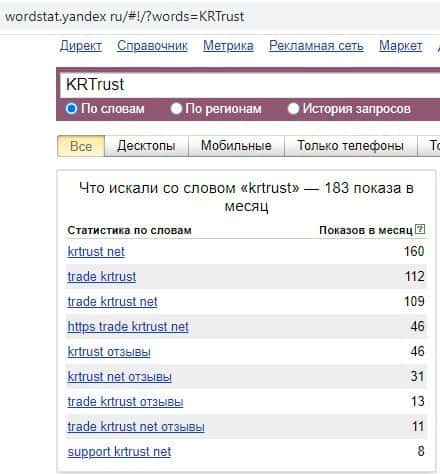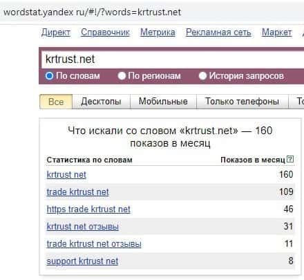 Третий и последний запрос в яндексе на английском языке с точкой "krtrust.net" выдает результат в такой же, как и в предыдущем случае - 160 показов в месяц.