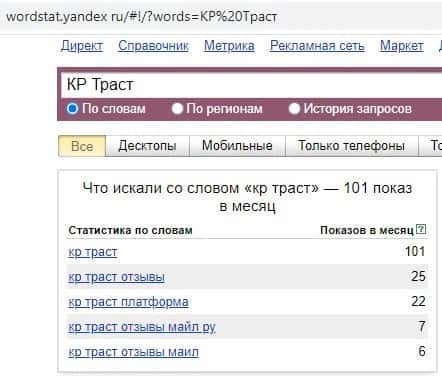 Начинаем с запроса на русском языке. Первый запрос на русском языке в Яндекс "КР Траст" выдает результат в 101 показ в месяц.