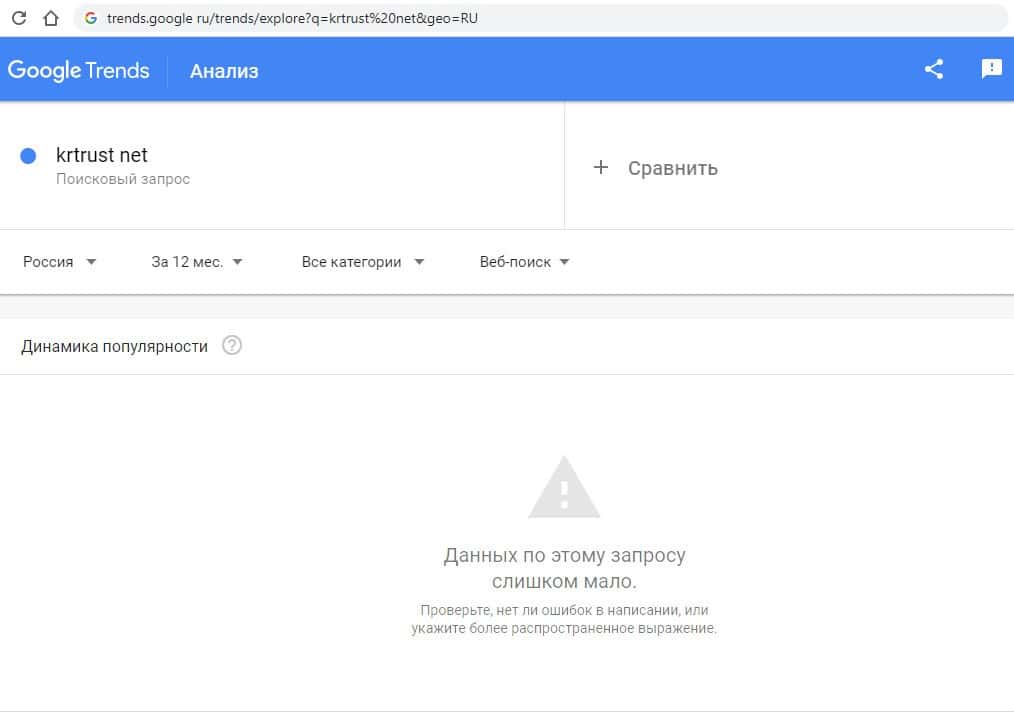 Последний запрос в Гугл на английском языке с точкой "krtrust.net" выдает результат в 0 показов в месяц. Как и во всех предыдущих случаях.