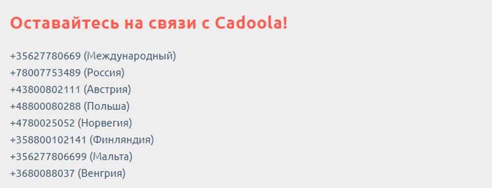 На сайте авантюристы Cadoola указали аж 8 номеров телефонов, по одному для страны. Фокус в том, что эти же номера фигурируют и в других лохотронах этой же группы мошенников: