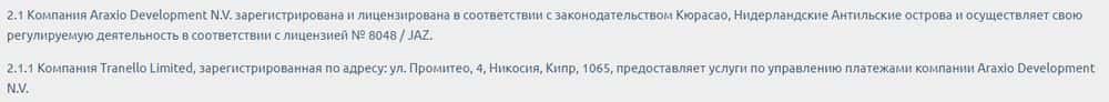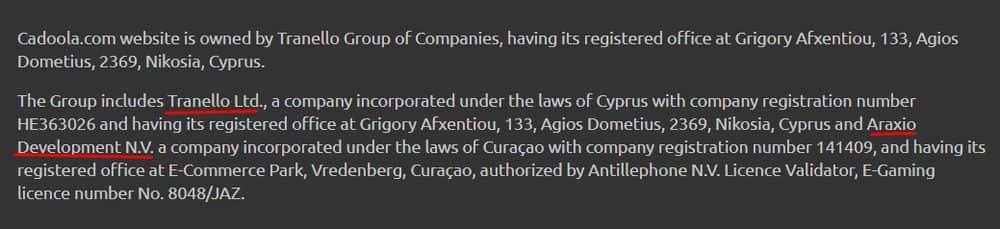 На сайте в качестве юридического лица, владеющего веб-шарагой Кадоола, указана некая оффшорная конторка Araxio Development N.V., которая клепает лохотроны один за другим.