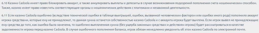 Поводов для блокировки у лохотронщиков Cadoola в клиентском соглашении прописано более чем достаточно. Например, если разводилам не понравится способ пополнения счета.