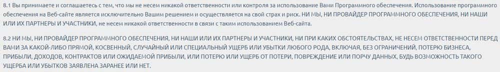 Отказу от ответственности шулера Кадоола посвятили ни один пункт. Они сразу говорят, что никакой ответственности нести за любые убытки не собираются, вне зависимости от причины.