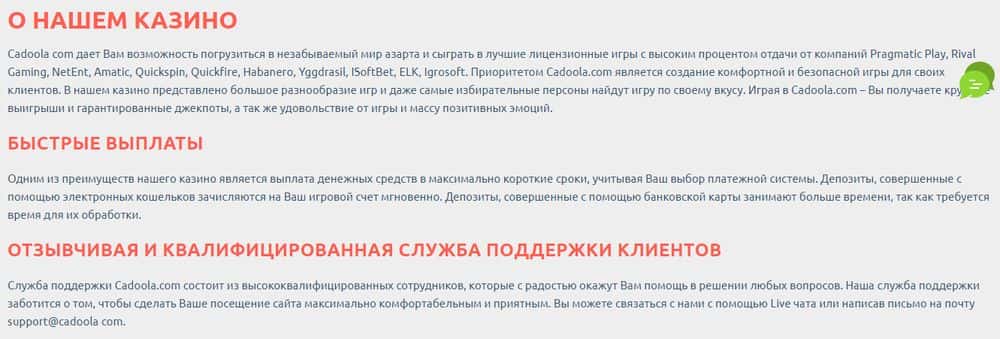 Есть на сайте махинаторов Кадоола и онлайн-чат. Правда, в случае возникновения проблем с выводом, добиться решения проблемы не получится - разводилы будут только тянуть время.