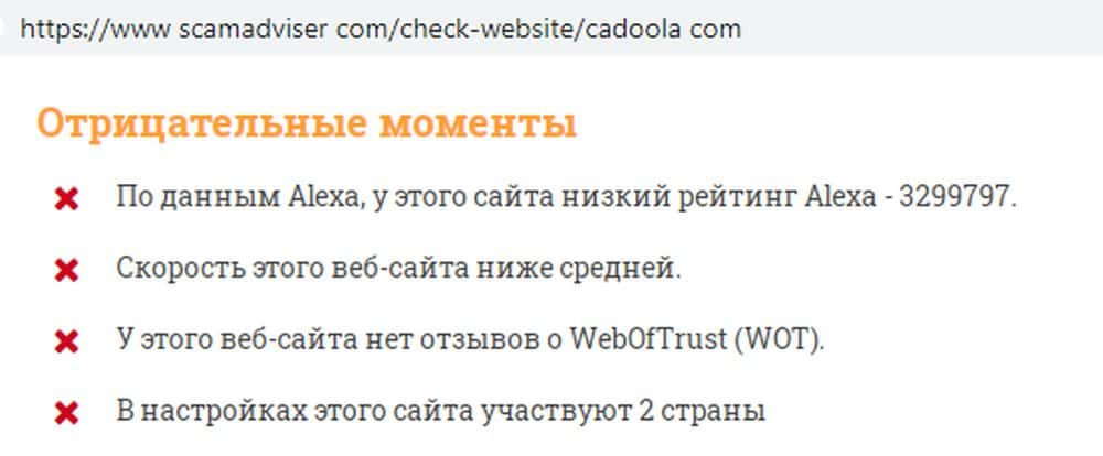 Онлайн-проект скамэдвайзер ком предупреждает, что с сайтом кидал Кадоола не все чисто: работает он слишком медленно, имеет низкую посещаемость; к тому же о нем мало отзывов.