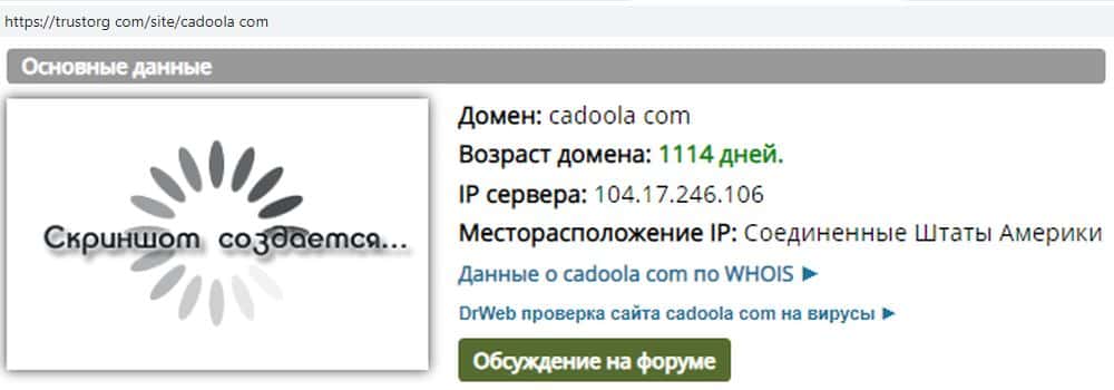 По данным ресурса трасторг ком домену шулеров Cadoola три года. Но это возраст домена, а не скам-проекта - сама структура мошенников появилась около года назад и перекупила его.