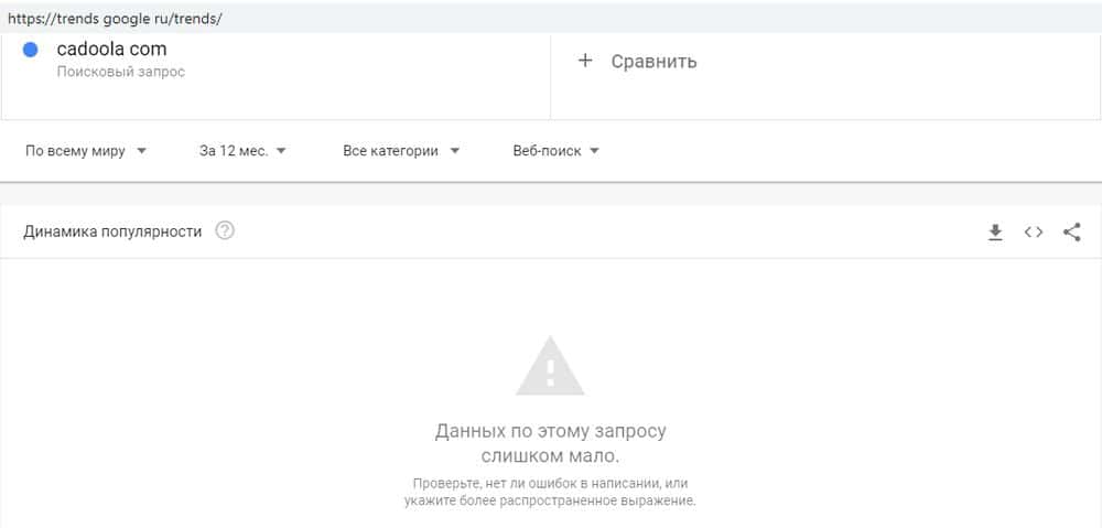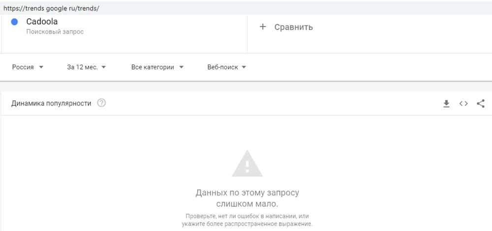Сервис Гугл Трендз показывает, что дешевый лохотрон Кадоола популярностью не пользуется. По запросу "Кадоола" к поисковику не обращались за весь прошедший год ни разу.