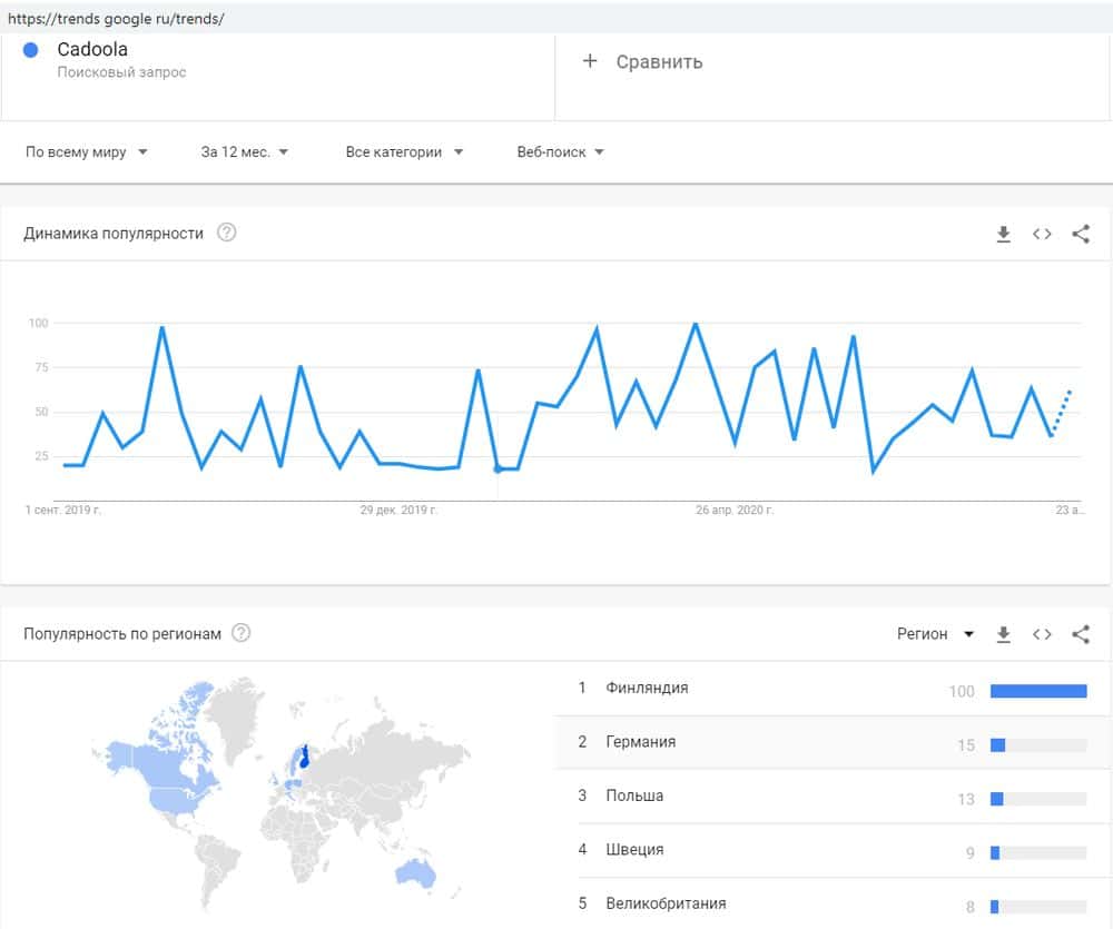 Если тот же запрос "Cadoola" проверить по миру, видно, что раньше мошенники работали с Финляндией, Германией, Польшей, и только недавно начали разводить русскоязычных игроков.