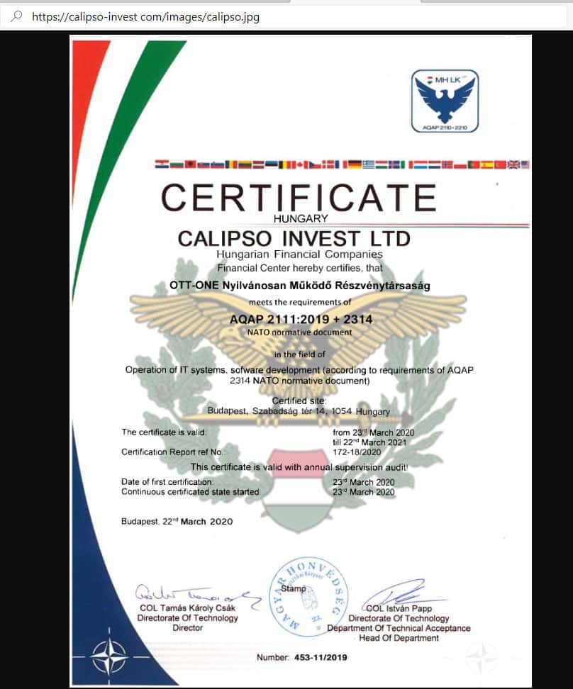 Хайп юридически принадлежит Calipso Invest LTD, о чем можно узнать из венгерского сертификата конторы мошенников. Если вам в поисковике встретятся эти жулики - не вздумайте туда заходить и дарить им свои деньги!