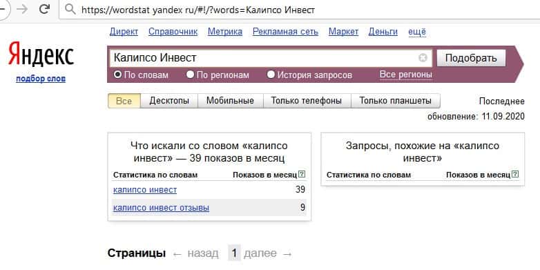Английский вариант наименования конторы "Calipso-Invest" пользователи Яндекса ищут почти с той же частотой.