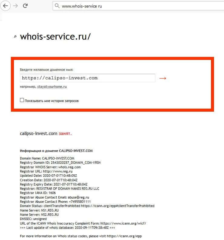 Такой-же результат дает запрос о написании домена "calipso-invest com" без точки.