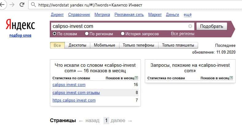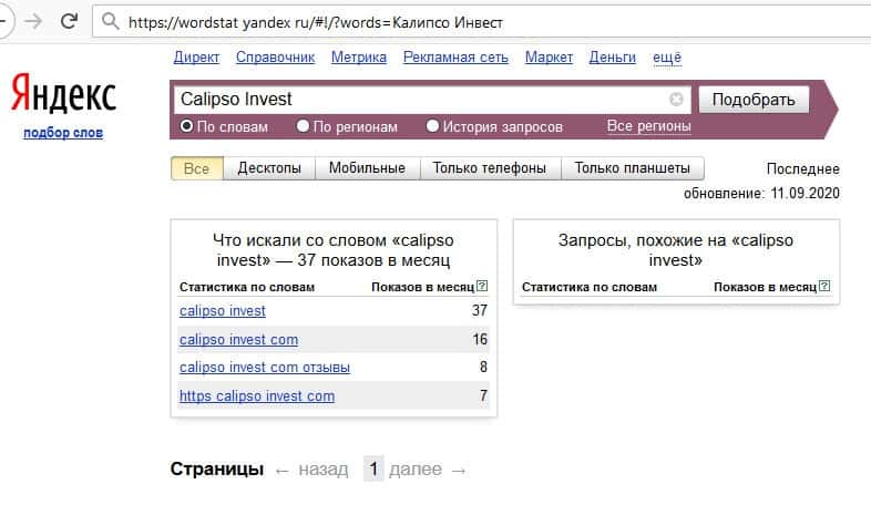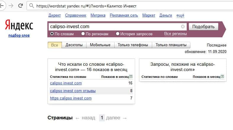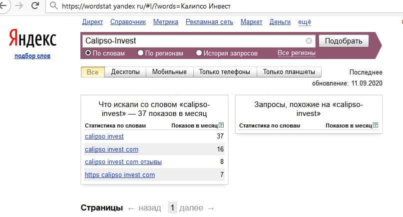 Статистика запросов о конторе Calipso-Invest в поисковике Яндекс
