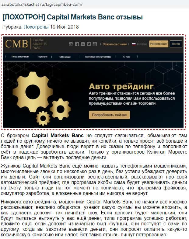 Информации о жуликах CapMBeu на просторах интернета немного, но все же отдельные издания высказывали о них свое мнение, что это самый обыкновенный лохотрон. Например, на сайте zarabotok24skachat ru прямо говорят о том, что это мошеннический брокер, с которым просто нельзя связываться. Так оно и оказалось.