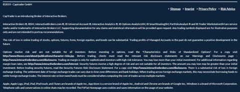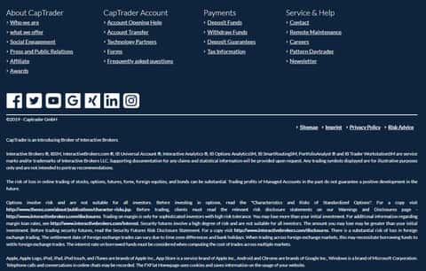 Завершается же сайт у аферистов CAPTrader довольно стандартно и ожидаемо, а именно типичным меню со стандартными ссылками на различные разделы сайта мошенников КАП Трейд, а так же предупреждением о рисках торговли у жуликов CAPTrader. На изображении, расположенном ниже, вы можете наглядно увидеть окончание подвального сайта лохотрона КАП Трейд.