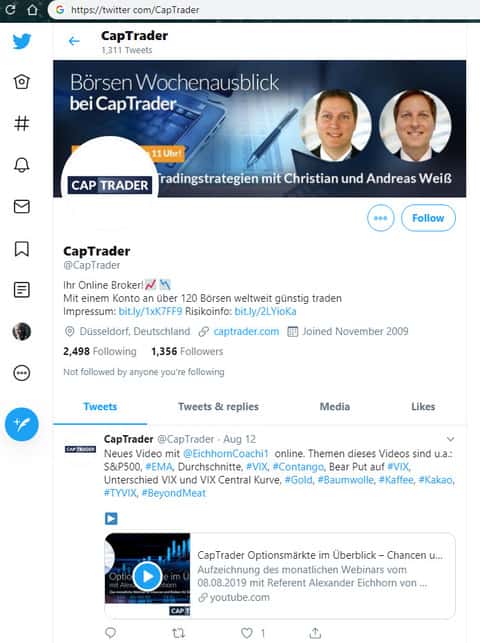 Имеется у жуликов CAPTrader и страница в социальной сети Twitter, где жулье КАП Трейд так же пожалели денег и не накрутили всего несколько тысяч подписчиков, однако активности на аккаунте у шулеров CAPTrader никакой не наблюдается. На изображении, расположенном ниже, вы можете увидеть внешний вид страницы мошенников КАП Трейд в социальной сети Твиттер.